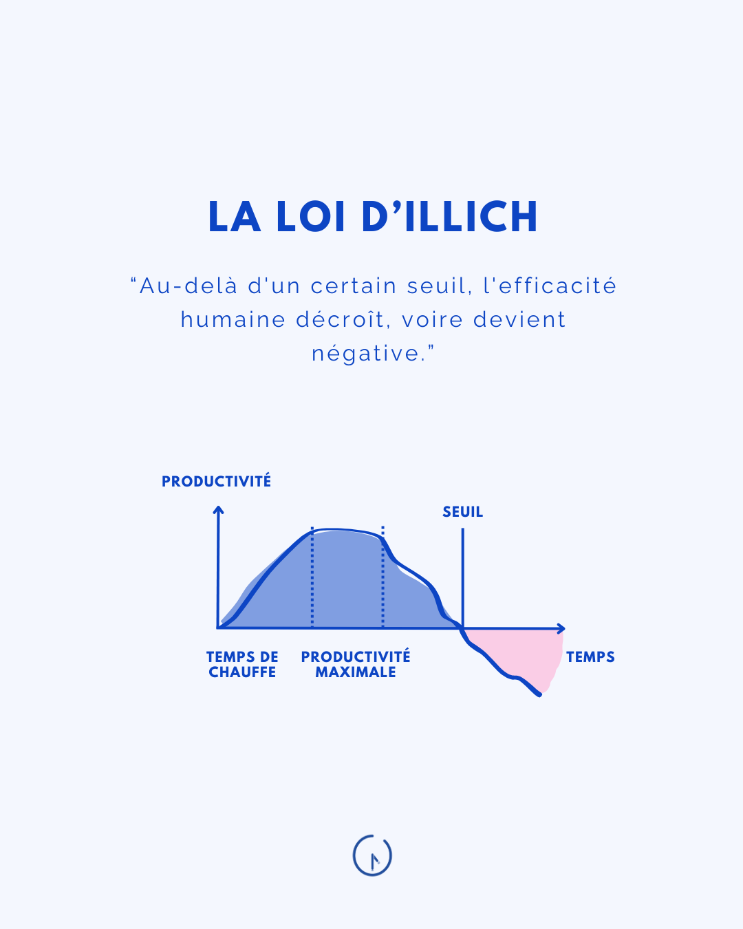 Ivan Illich, philosophe et penseur de l’écologisme, formule cette loi qui stipule que l’efficacité humaine décroît après une certaine durée de travail. En d’autres termes, il y a un seuil au-delà duquel travailler plus ne nous rend pas plus productifs, mais au contraire, nous épuise et diminue notre efficacité. Ce seuil est évidemment propre à chaque individu, même si les recherches tendent à converger vers une productivité maximale entre 4 et 6h par jour.